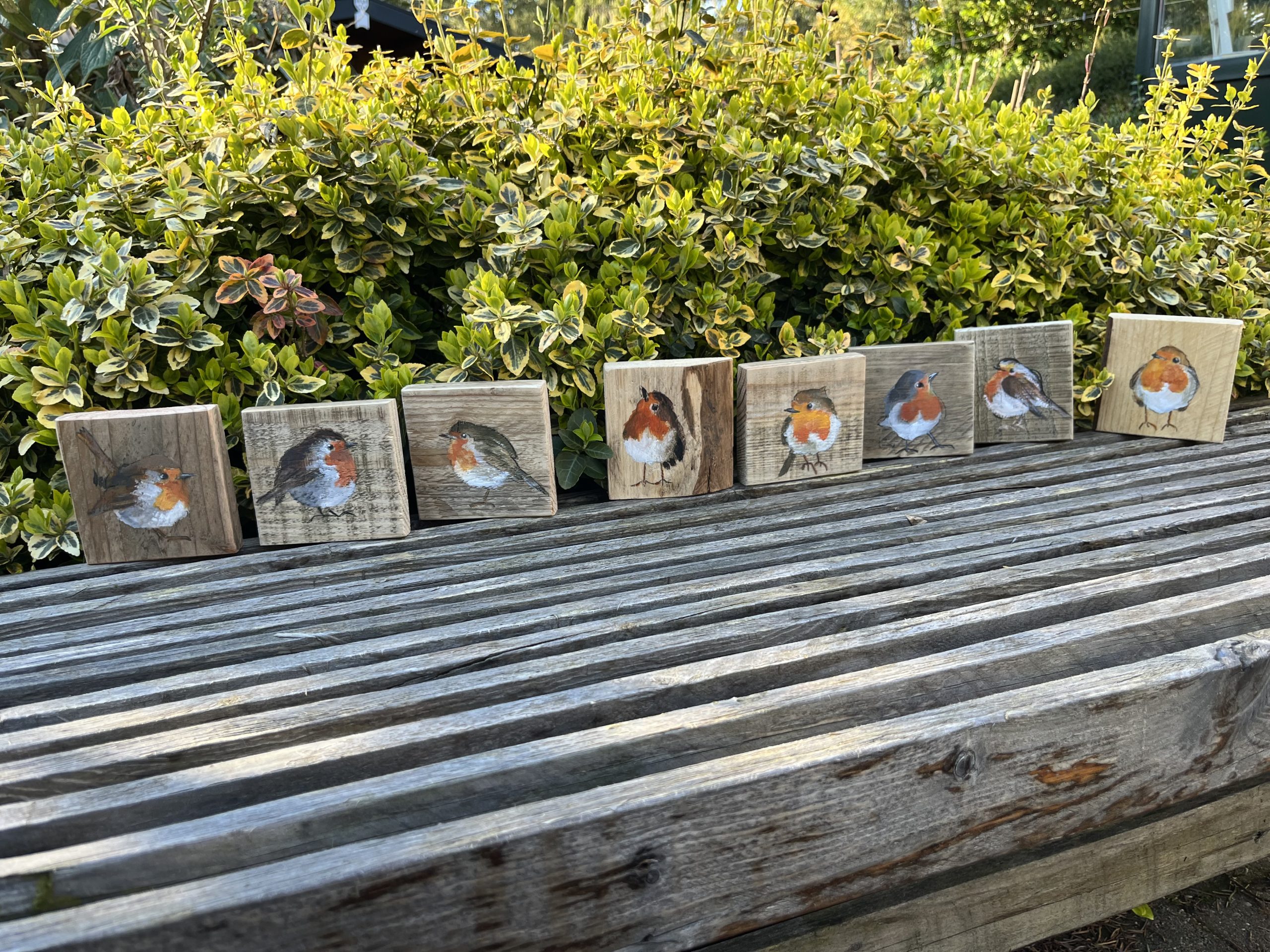 Er zijn altijd vele roodborstjes, koolmeesjes en IJsvogeltjes op hout te koop in mijn atelier. Ze zijn wel snel uitverkocht. Dit is een leuk overzicht van een aantal roodborstjes bij elkaar.
